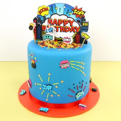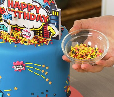 A superhero birthday cake is one of the most popular kids' birthday cake themes. Often requested for parties, this comic book style birthday cake isn’t just for children though, big kids will love it too. This short article shows how to decorate a super-duper on trend superhero celebration cake simply using cake sprinkles in innovative ways, adding sugar decorations and a colourful cake topper, and finishing off with the all-important birthday candles.