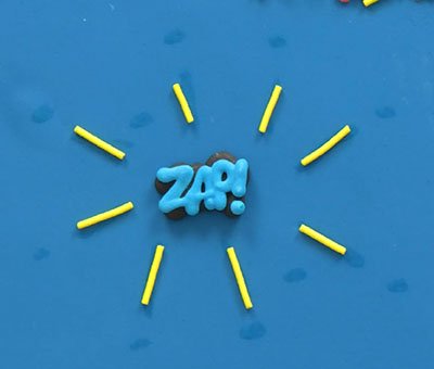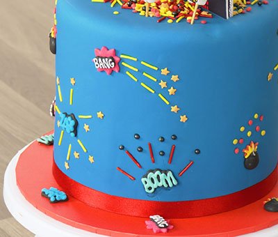Using a small paint brush and some edible glue, make amazing patterns and designs around the individual cake decorations to really bring the zaps, pows and bangs to life! This does take a bit of patience, but the results are really impactful. They add movement and energy to the side of your cake for added wow factor!