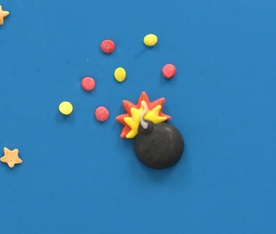 Stir them all together in a bowl to see your unique sprinkles mix combine, adding more of the colours and shapes you want to focus on. When sprinkled on top of the cake, your DIY mix will create a wonderful impression of the aftermath of an explosion, and will match perfectly with this gumpaste comic book style cake topper.