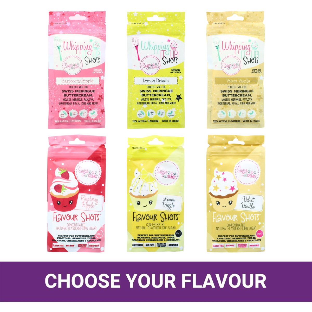 Sugar and Crumbs Shots are concentrated smaller sized packs, the Flavour Shots are 50g packs of flavoured icing Sugar and the Whipping It Up shots are 70g packs of Swiss Meringue Buttercream mix.
