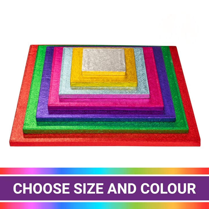 These square cake boards, also known as cake drums, measure 12mm thick and are wrapped in attractive foil.