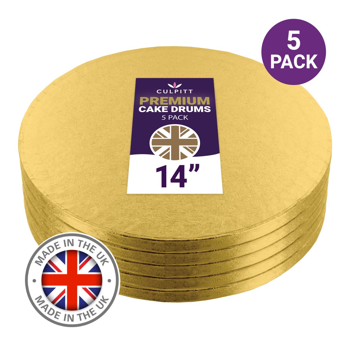 Bulk packs of 5 premium 14" round gold cake boards are an easy way for home bakers, hobby cake decorators and small businesses to achieve professional cake presentation. Culpitt premium cake drums offer superior strength, reliability and quality for the most exceptional homemade cakes.