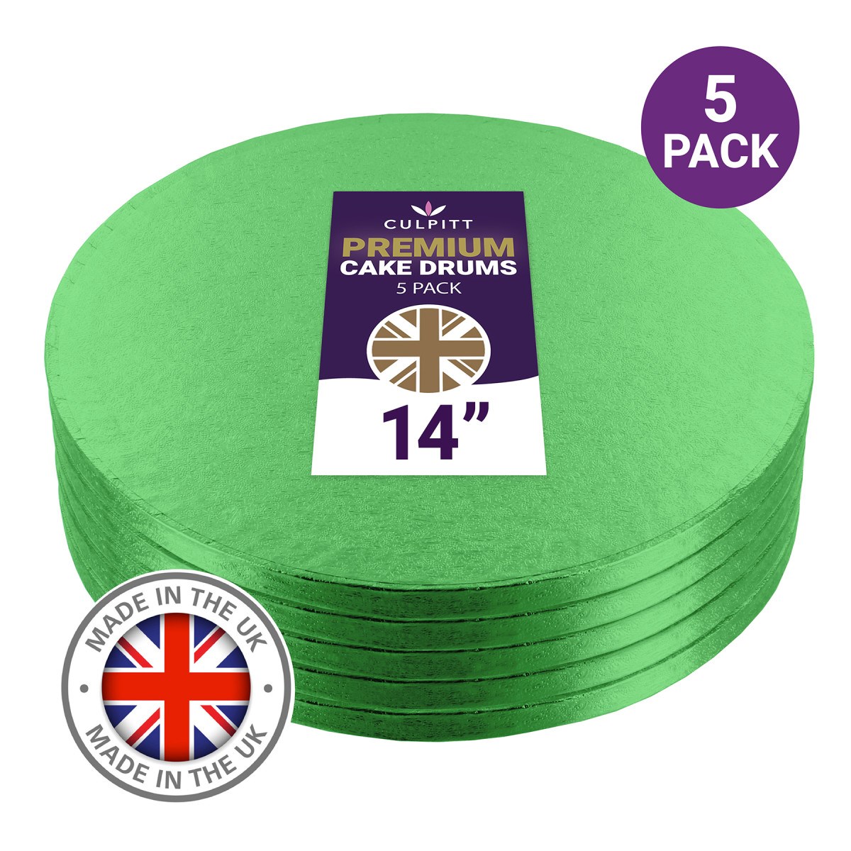 Bulk packs of 5 premium 14" round green cake boards are an easy way for home bakers, hobby cake decorators and small businesses to achieve professional cake presentation. Culpitt premium cake drums offer superior strength, reliability and quality for the most exceptional homemade cakes.