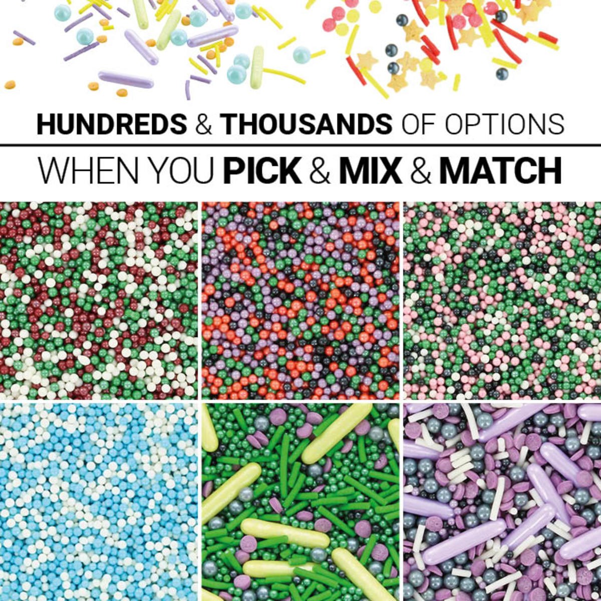 Select the colours and types of sprinkles required that allow you to create your own unique and individual cake decorating combinations. Simply mix and match across the range for endless original and striking possibilities.