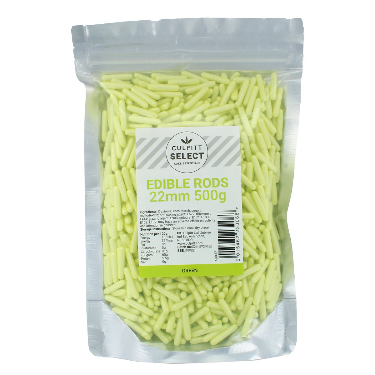 This exceptional value 500g pouch of edible green rods can be used on its own or mixed with other options purchased in the range. These shimmer green rods provide quick, easy and colourful impact to achieve the exact look required to decorate cakes.