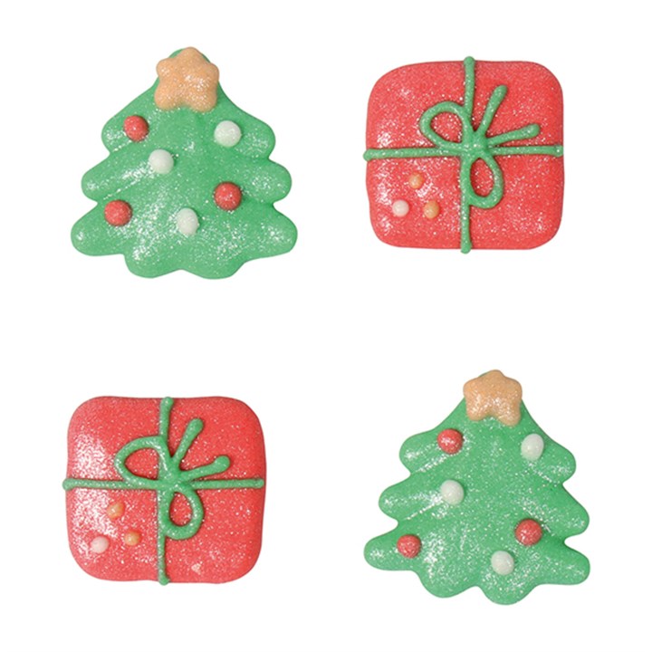 This bulk pack of 250, Hand piped Christmas tree & parcel sugar decorations are perfect for adding to your Christmas celebration cakes, cupcakes and cookies.