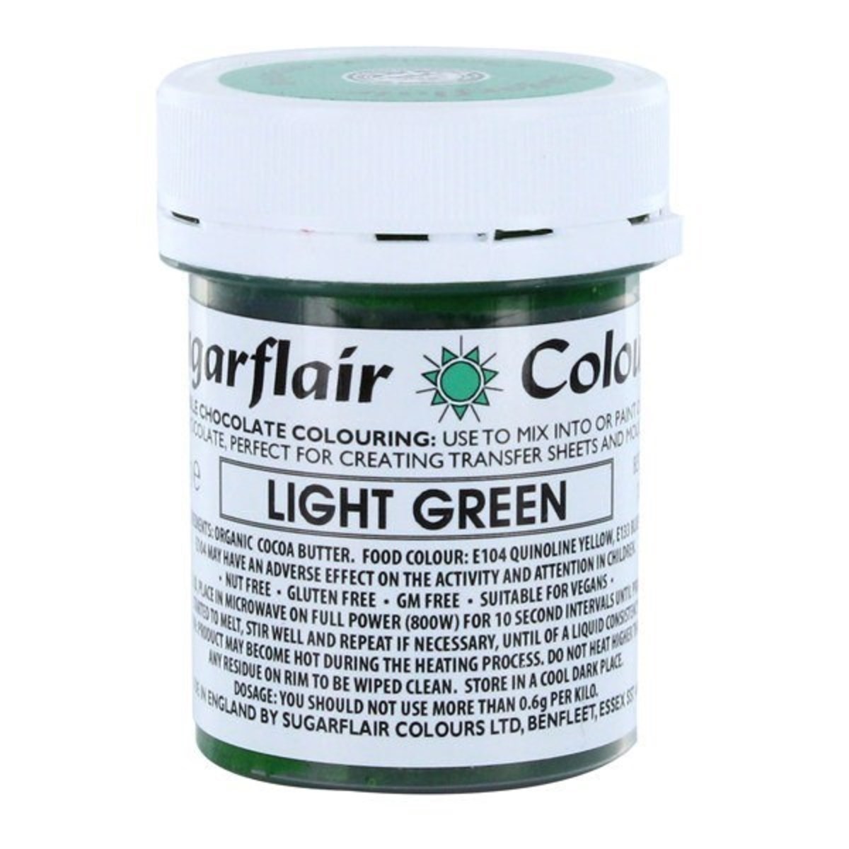 This Sugarflair Organic Cocoa Butter based Chocolate colouring in light green is perfect for adding a professional colour to your chocolate work, to match any occasion or themed decoration.