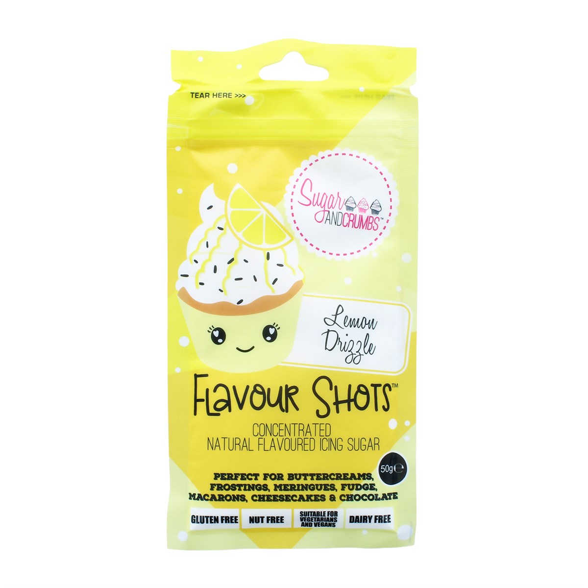 Lemon Drizzle Flavour Shots are a small 50g concentrated natural flavoured icing sugar formula by Sugar and Crumbs.