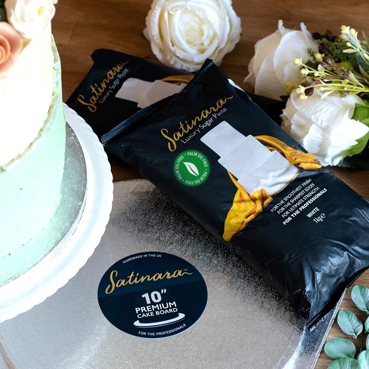 “ Satinara is the UK's new Luxury Sugar Paste. It has been expertly formulated to ensure you get the best possible results. Satinara understands that cake makers are looking for three key attributes in their sugar paste icing; Due to its superior formulation, Satinara is designed with these three attributes in mind, and its no-fail formulation means that it can be used by experts or home bakers and will always deliver a crack-free silky smooth finish. Satinara is designed to be particularly suitable for covering tall, complex cakes as it can be rolled to just 2mm thickness whilst maintaining its integrity, allowing you to create those crisp, sharp edges. This also makes it a great money-saver. In tests, one 5kg pack of Satinara covered three large cakes* and there was still plenty left over to make some sugar models. Making sugar models such as simple roses and characters can easily be achieved without additives. If you want to create more intricate models such as fine flowers or detail work, then a little tylo powder can be added to provide enhanced rigidity. Satinara is available in White in 1kg packs and a 3kg tub. If you require a coloured paste then we recommend colouring the paste with a few drops of a high quality food colour such as Colour Splash gels or dusts. Be careful to not saturate the icing with liquid food colours as this would alter the texture of the paste. Don't just take our word for it, here is what some professional cake makers have said after testing Satinara; “ ..you get that really smooth, perfect, professional finish” In fact, we're so sure that you'll love Satinara sugar paste, that we're backing it with our very own money back guarantee. If for any reason you are not satisfied with your first purchase of Satinara, then you can get in touch with us and we'll credit you a refund. For more information, see our Terms ≈ Conditions. Instructions for use: To get the best from Satinara, use the paste at room temperature** Depending on the amount of icing you need divide the paste into smaller pieces. Knead the paste thoroughly to ensure the gums are activated as this will achieve maximum pliability and strength. Use a small amount of icing sugar on your work surface and rolling pin, and roll to the desired thickness. Store any unused sugar paste in an airtight container or sealed bag away from humidity, heat and bright lights. * Cake coverage achieved with 3.4kg : 10" x 8" round, 12" x 4" round, 10" x 2" square ** You can microwave the paste for a few seconds to bring it up to ambient temperature but please note: microwaving the paste will not activate the gums required to give it it's pliability. This will need to be achieved by kneading the paste as per the above instructions.
