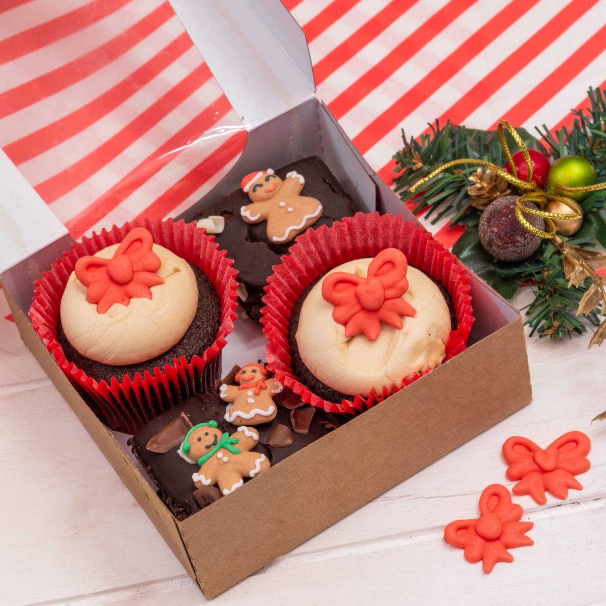 Each red bow topper is hand-piped from royal icing. This festive set is perfect for using to decorate around the edge of a Christmas cake or to top cupcakes.