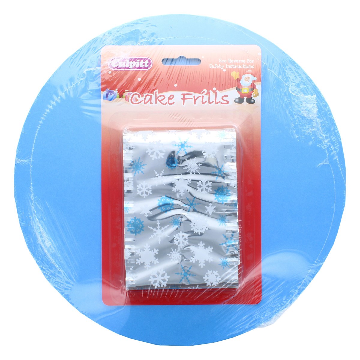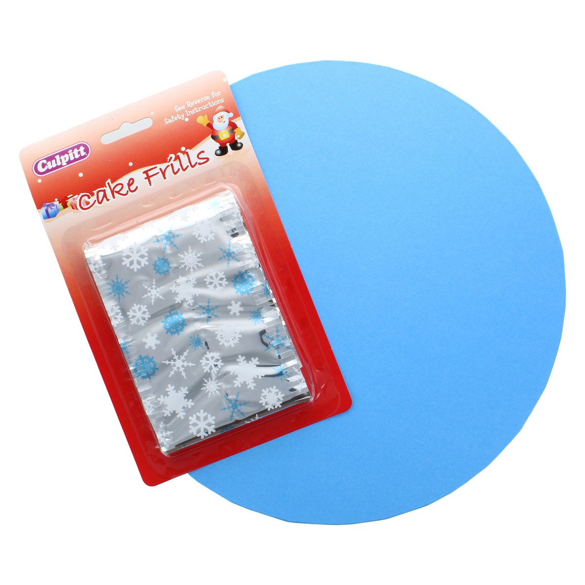 Each pack contains 1 x 10" blue masonite board and 1 x silver foil cake frill with white and blue snowflake print.