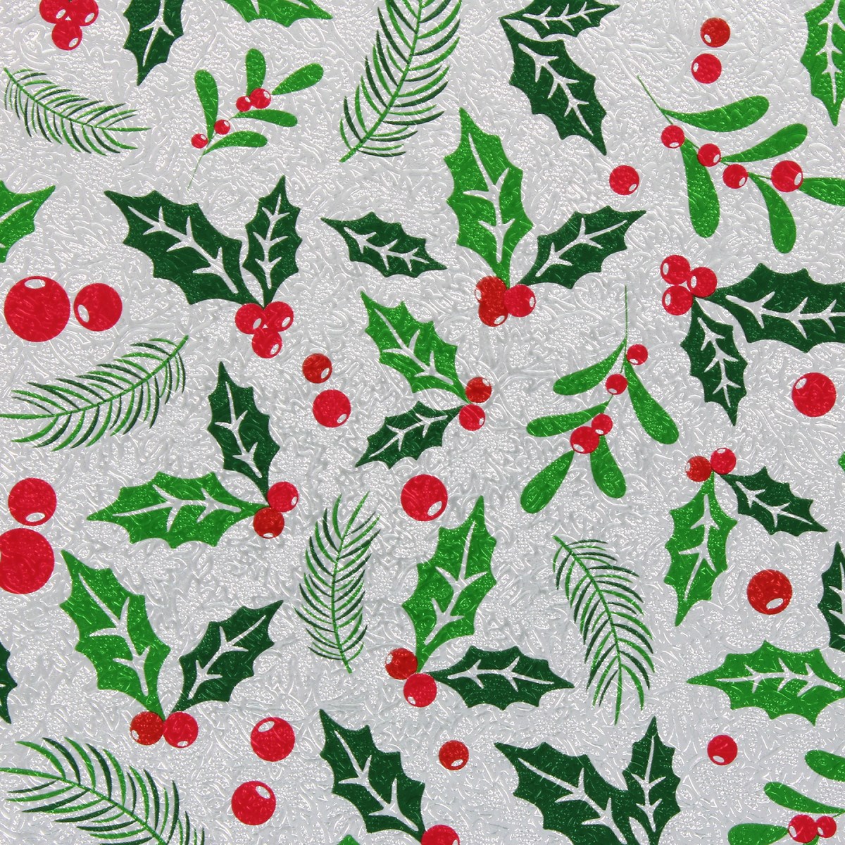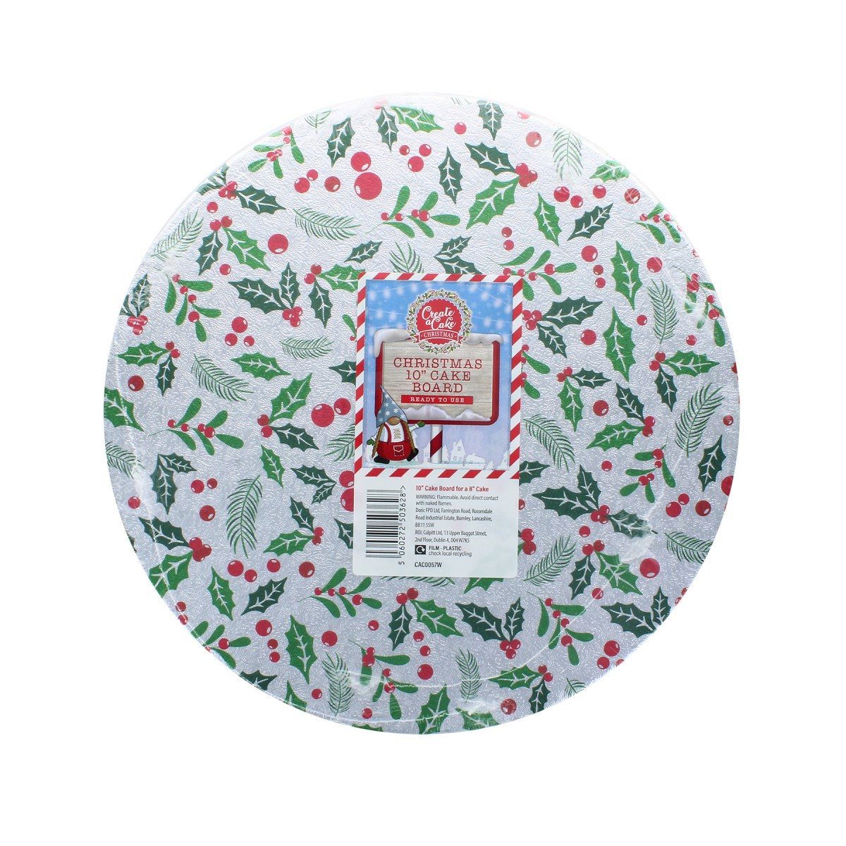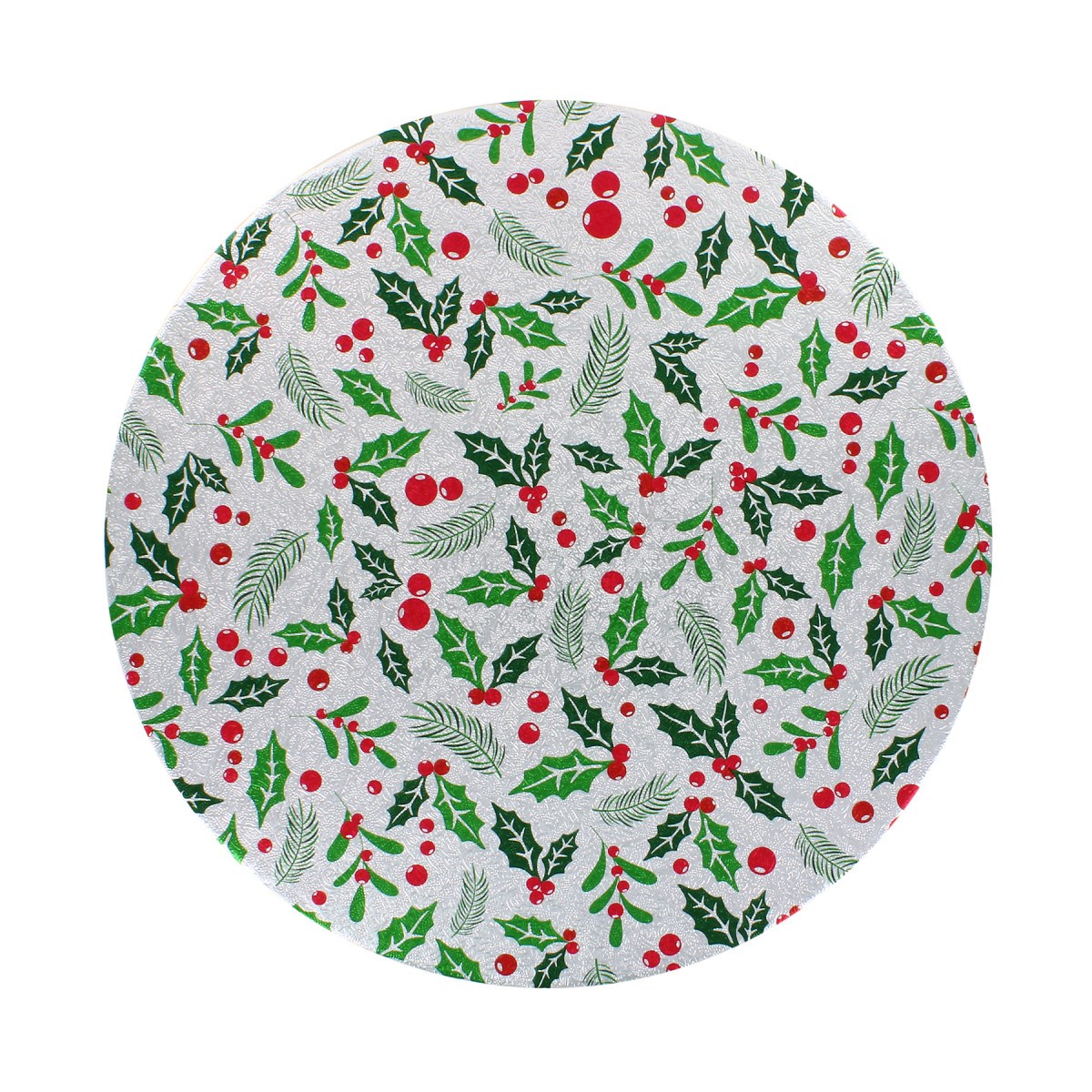 Each 10" round card is covered with a silver embossed foil with printed pattern. The printed design features green holly and mistletoe leaves and red berries. The double thick Christmas cake cards are individually shrink-wrapped and labelled.